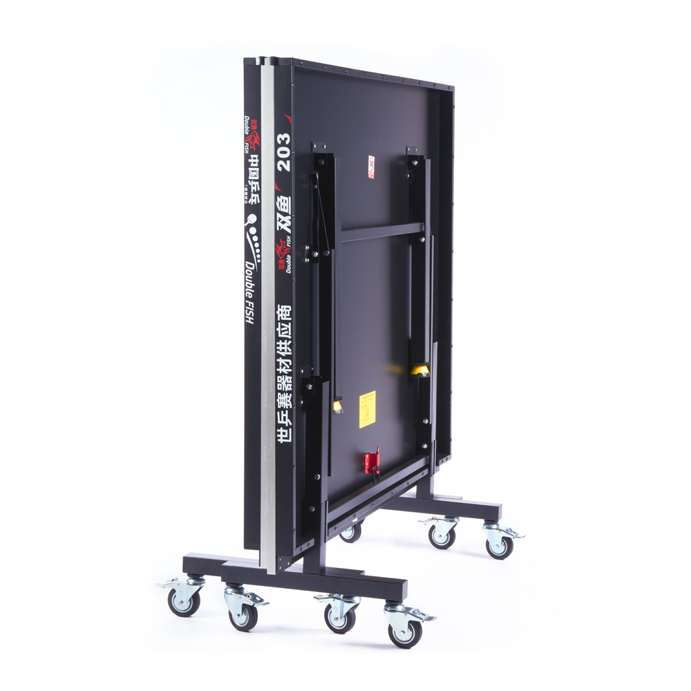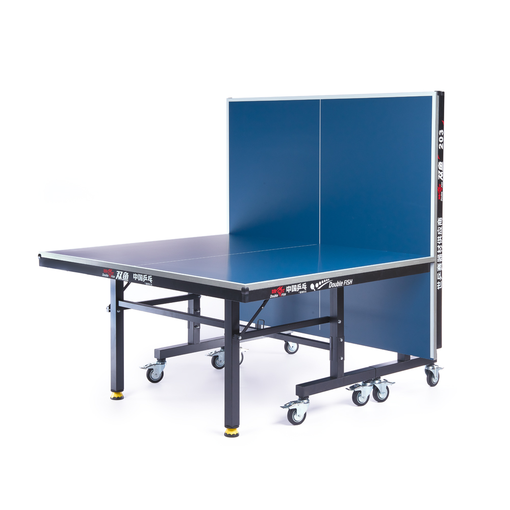 Теннисный стол Double Fish 203M-1 оснащен игровой поверхностью из МДФ толщиной 18 мм, гарантирующей отличный отскок мяча, а его конструкция состоит из двух отдельных половин, которые легко складываются для компактного хранения и удобства перемещения на восьми колесах диаметром 75 мм с надежными стопорами, обеспечивающими мобильность и устойчивость. Надежность и стабильность достигаются благодаря раме из стальных трубок 50х20 мм, дополнительной передней планке и регулируемым по высоте ножкам профиля 40х40 мм, при этом стол поставляется в практически готовом к игре виде — нужно лишь установить колеса, а встроенная система блокировки надежно фиксирует его в сложенном состоянии для безопасного хранения, и, конечно, в комплект уже входят сетка с креплениями-стойками.ХарактеристикиВид