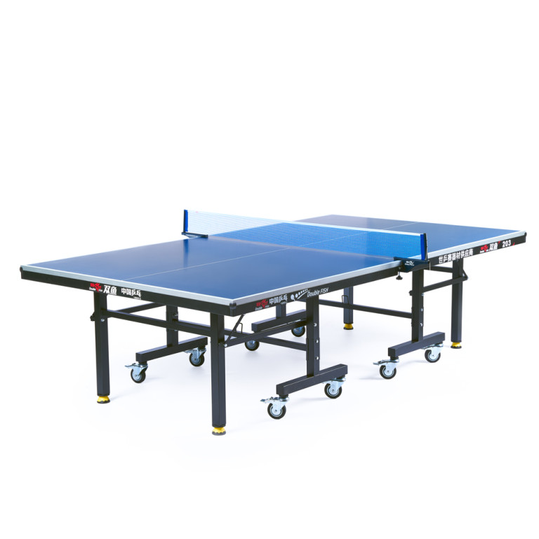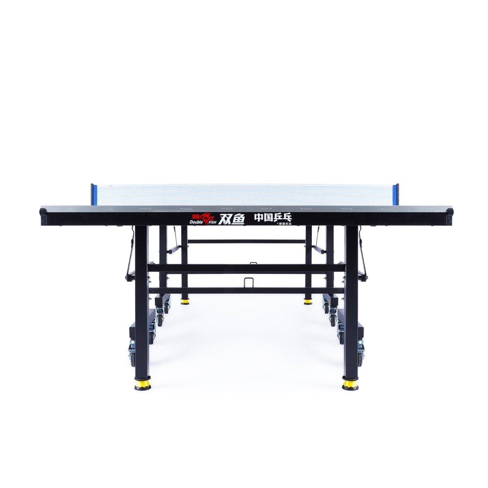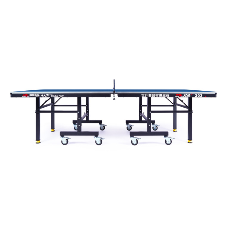 Теннисный стол Double Fish 203M-1 оснащен игровой поверхностью из МДФ толщиной 18 мм, гарантирующей отличный отскок мяча, а его конструкция состоит из двух отдельных половин, которые легко складываются для компактного хранения и удобства перемещения на восьми колесах диаметром 75 мм с надежными стопорами, обеспечивающими мобильность и устойчивость. Надежность и стабильность достигаются благодаря раме из стальных трубок 50х20 мм, дополнительной передней планке и регулируемым по высоте ножкам профиля 40х40 мм, при этом стол поставляется в практически готовом к игре виде — нужно лишь установить колеса, а встроенная система блокировки надежно фиксирует его в сложенном состоянии для безопасного хранения, и, конечно, в комплект уже входят сетка с креплениями-стойками.ХарактеристикиВид