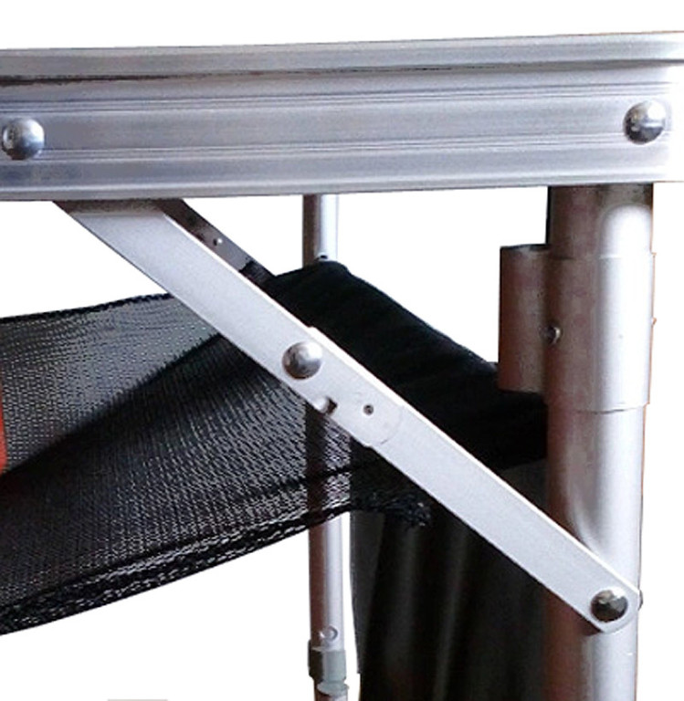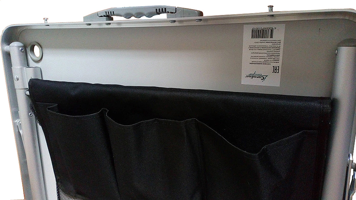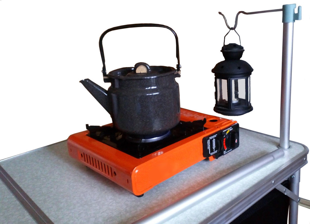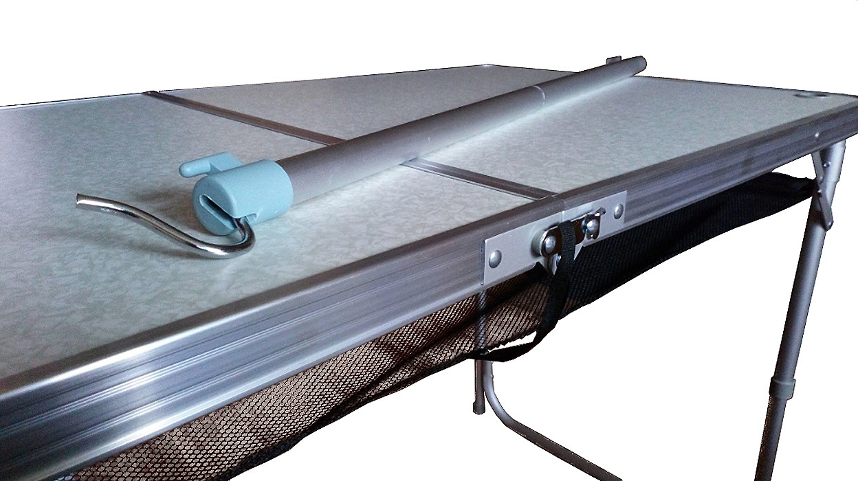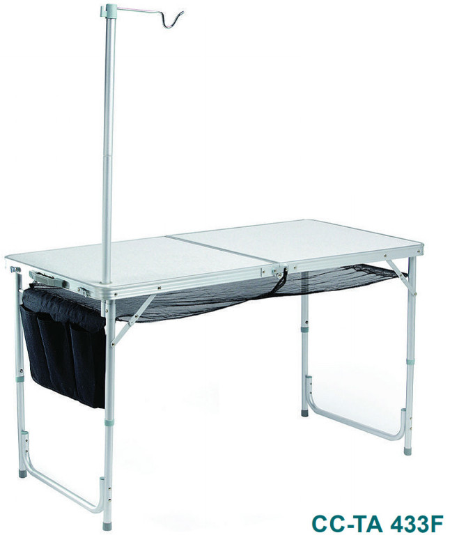 Алюминиевый каркас, телескопические ножки (два уровня высоты), поперечный усилитель — не проваливается в песок. Плюс стойка для лампы, сетчатая полка и боковой органайзер с карманами для посуды и мелочей. Складывается в компактный «чемодан». Для тех, кто любит порядок на выездной кухне.ХарактеристикиТип