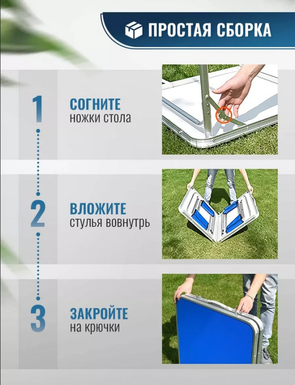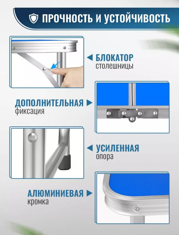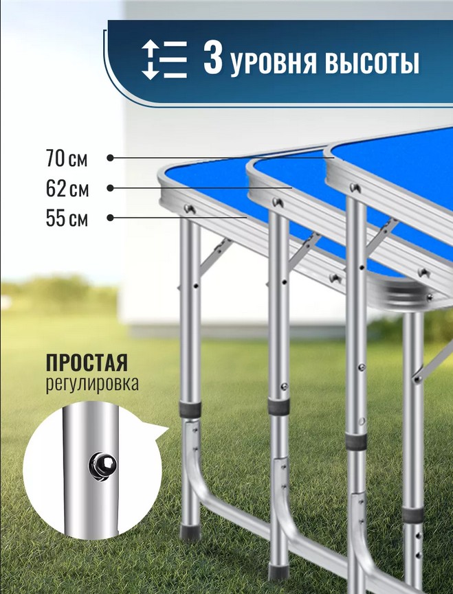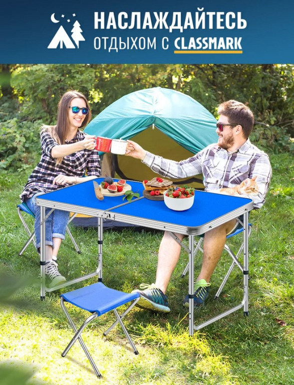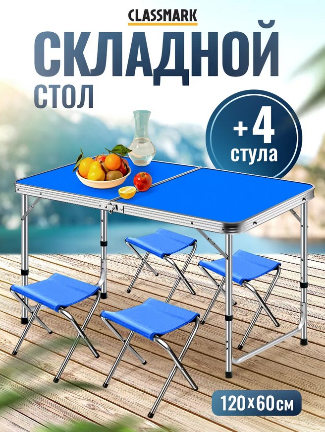 Комплект мебели ВидПрямоугольный Толщина столешницы3,5 см Материал столешницыМДФ ПокрытиеМеламин ?Нагрузка кг.Максимальный вес который может выдержать изделие100 ДополнительноНагрузка на стол 30 кг МатериалМДФ, Алюминий КомплектацияСтол для пикника раскладной , 4 Складных стулья ПрофильДиаметр трубы стульев: 18мм Складная конструкцияЕсть Кол-во мест6 Особенностьвысота стла регулируется в 3-х режимах (55 см, 60 см и 70 см) и фиксируется с помощью кнопки Регулировка высотыЕсть КаркасАлюминий Защита от влагиЕсть Габариты120х60х70 см Размер упаковки в см (Д*Ш*В)62х62х7,5 см Размер в сложенном виде60х60х7 см (стол) Вес в упаковке кг6.3 Гарантия14 дней ПроизводительКитай ИмпортерООО "Централ Спорт" г. Минск 220012, ул.Чернышевского 8 каб. 23 -