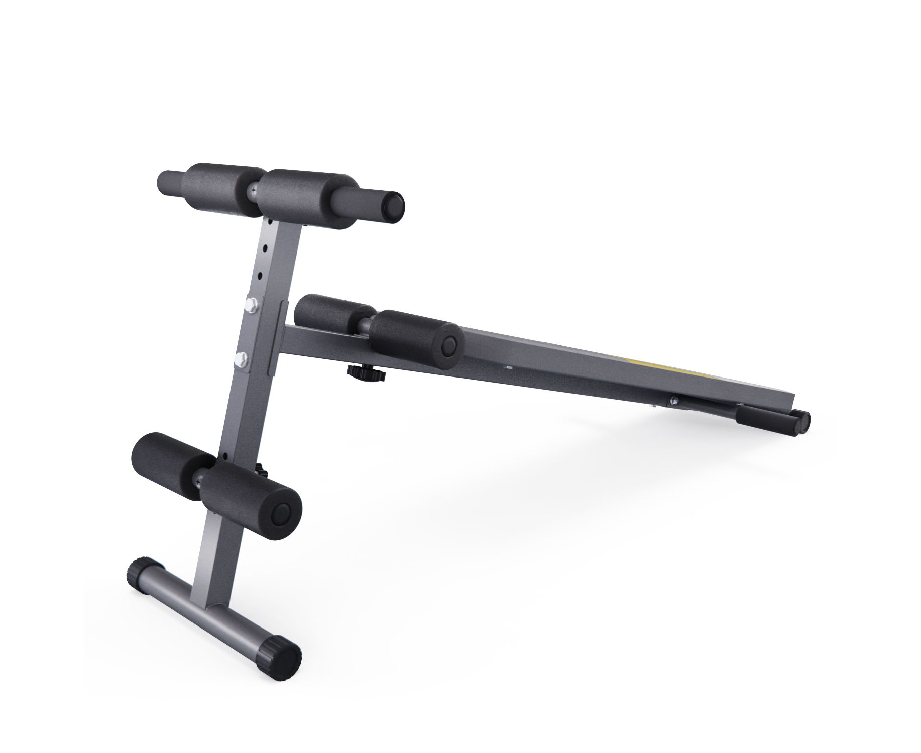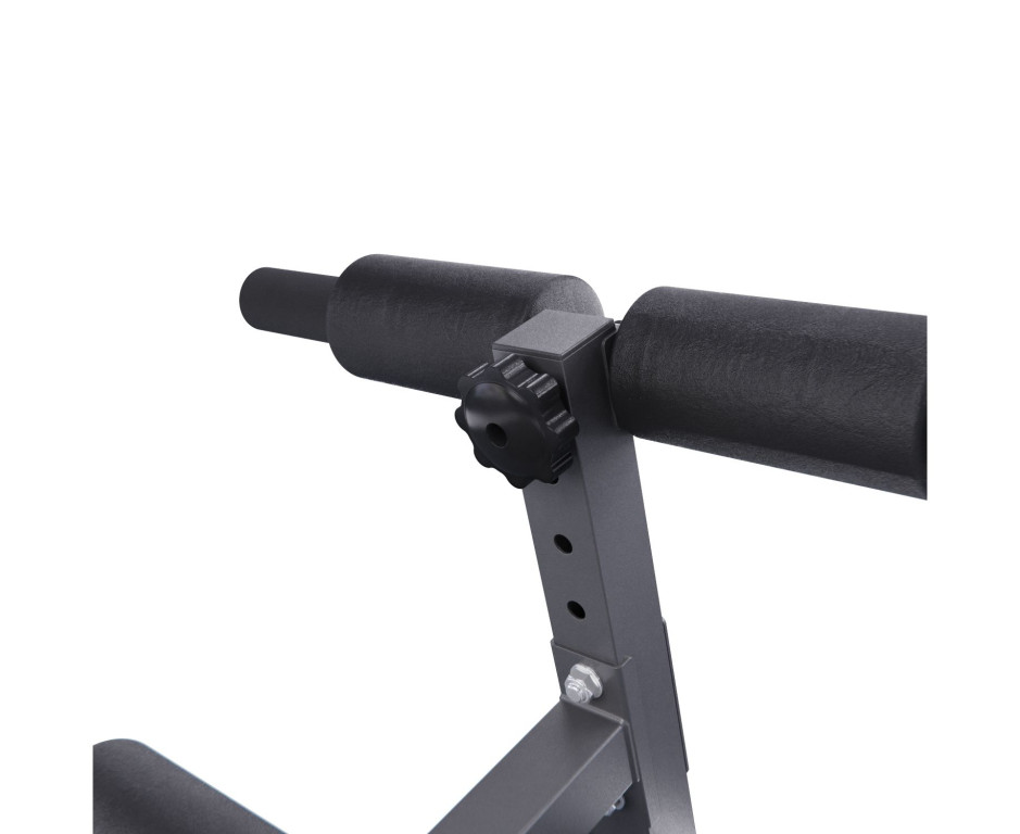Ключевой особенностью является 5 уровней регулировки угла наклона, что позволяет эффективно прорабатывать разные группы мышц. На скамье можно выполнять подъёмы корпуса и ног для пресса, а также упражнения с гантелями. Нижние валики регулируются на 4 уровня для надёжной фиксации стоп, а эргономичные валики из вспененного материала обеспечивают комфорт. В комплект входят стойка для отжиманий и упоры, расширяющие спектр упражнений.
