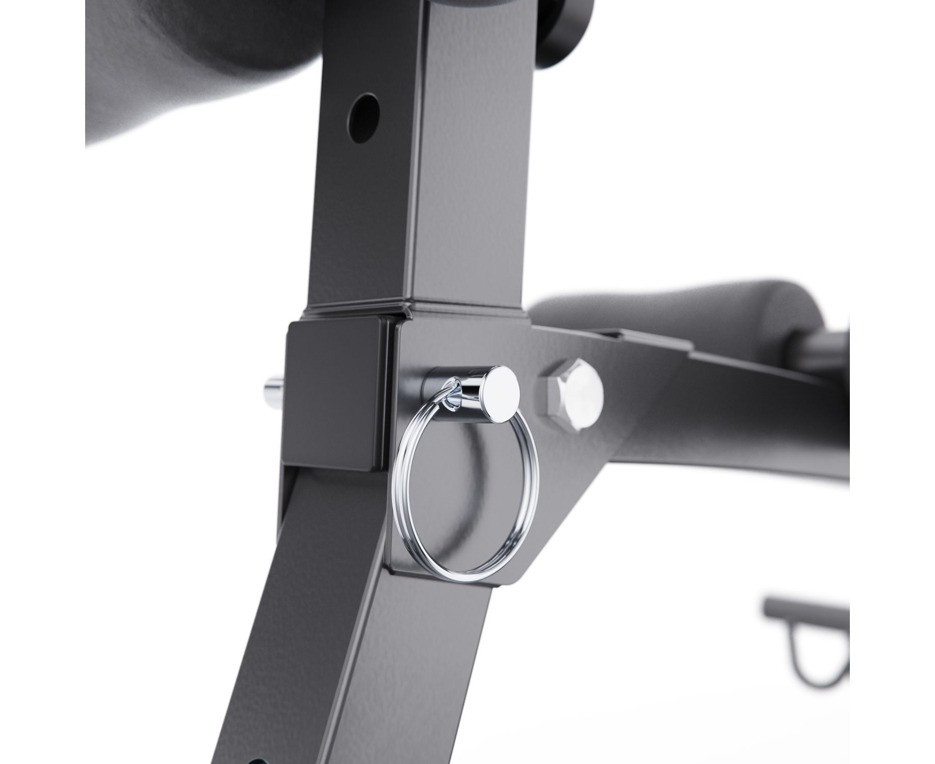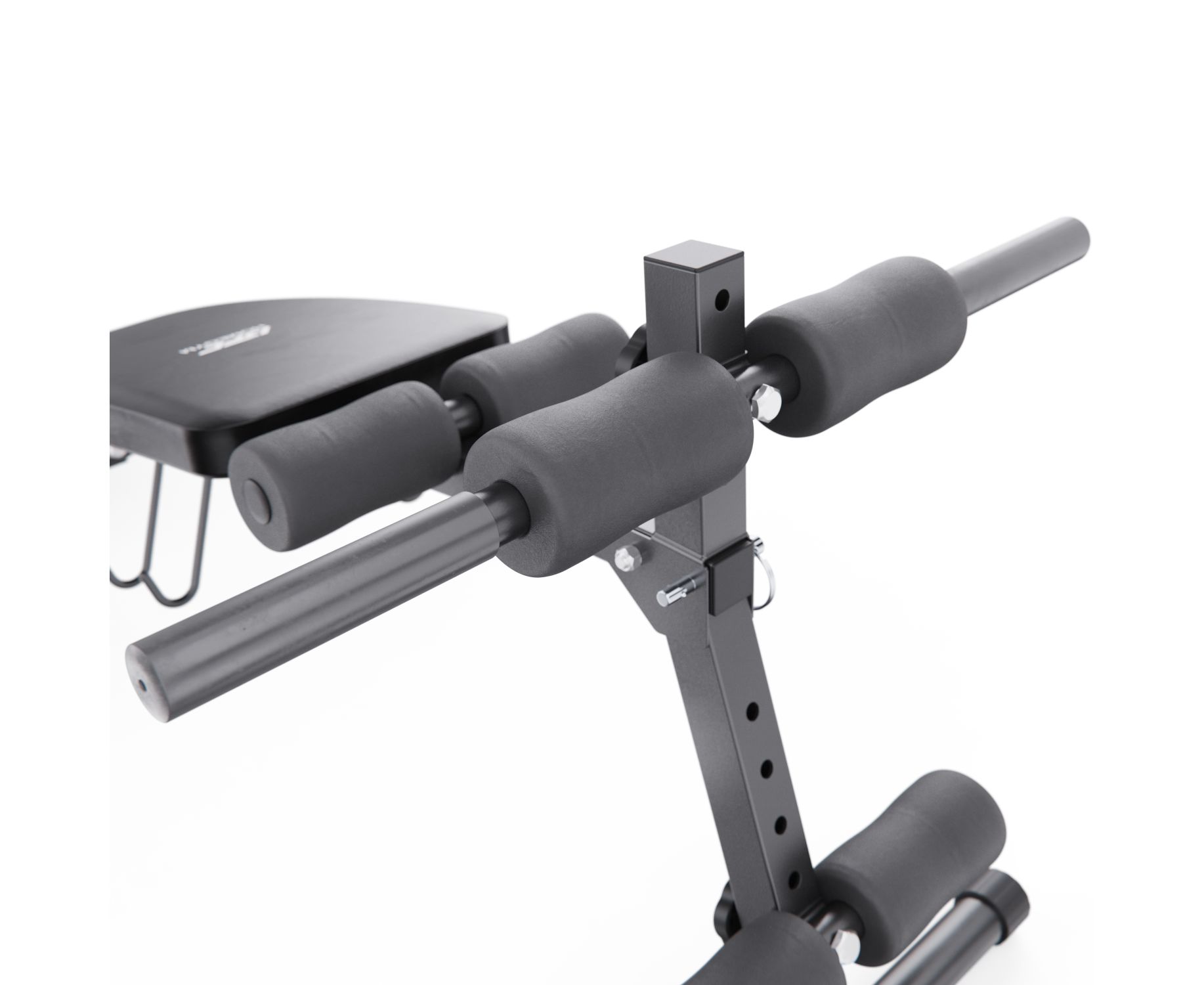 Ключевыми особенностями являются регулировки, позволяющие адаптировать скамью под индивидуальные параметры: угол наклона регулируется на 4 уровня, верхние валики — на 3 уровня, нижние — на 4 уровня. Это обеспечивает правильное распределение нагрузки и комфорт во время упражнений.