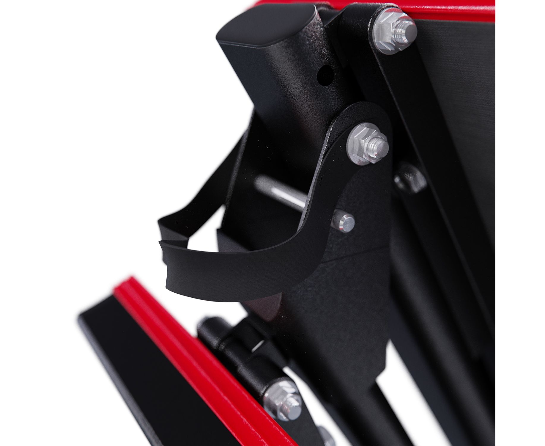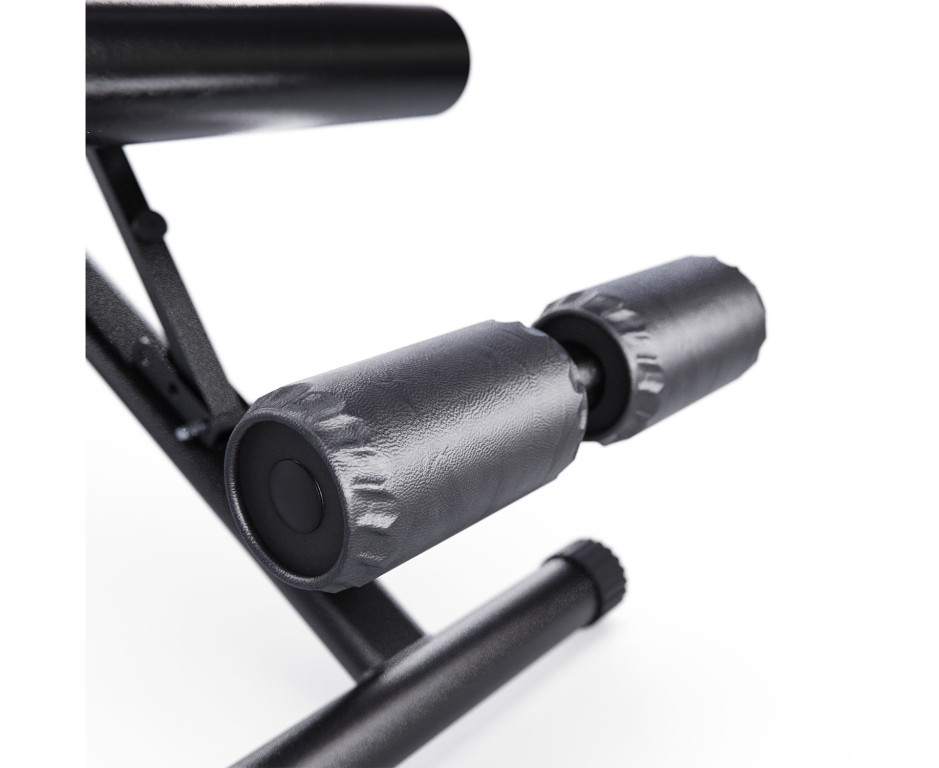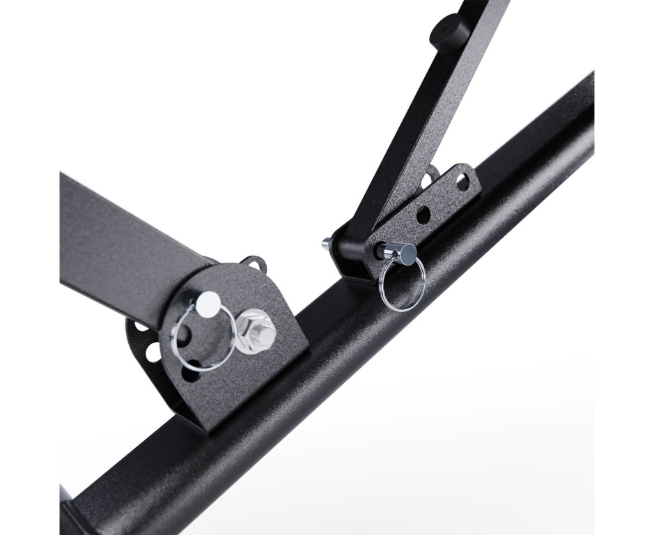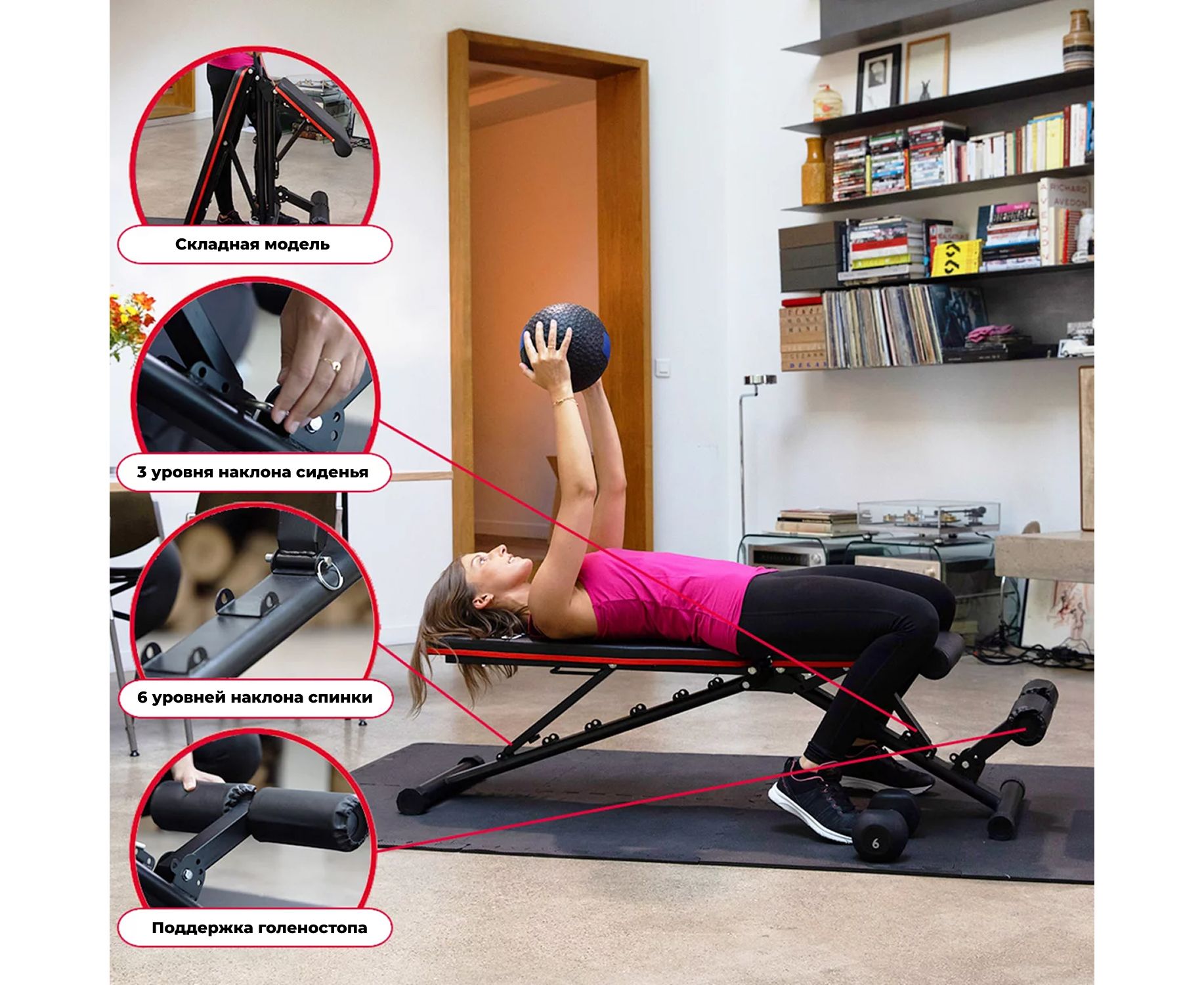 Конструкция обеспечивает стабильность благодаря профилю рамы 30×70×1,5 мм и компенсаторам неровности пола. Скамья оснащена регулируемой спинкой с фиксацией в 6 положениях, что позволяет выполнять жимы под разными углами. Сиденье регулируется на 3 уровня, высота от сиденья до пола составляет 41 см. Валики для ног из вспененного материала также имеют 3 уровня регулировки для надёжной фиксации.